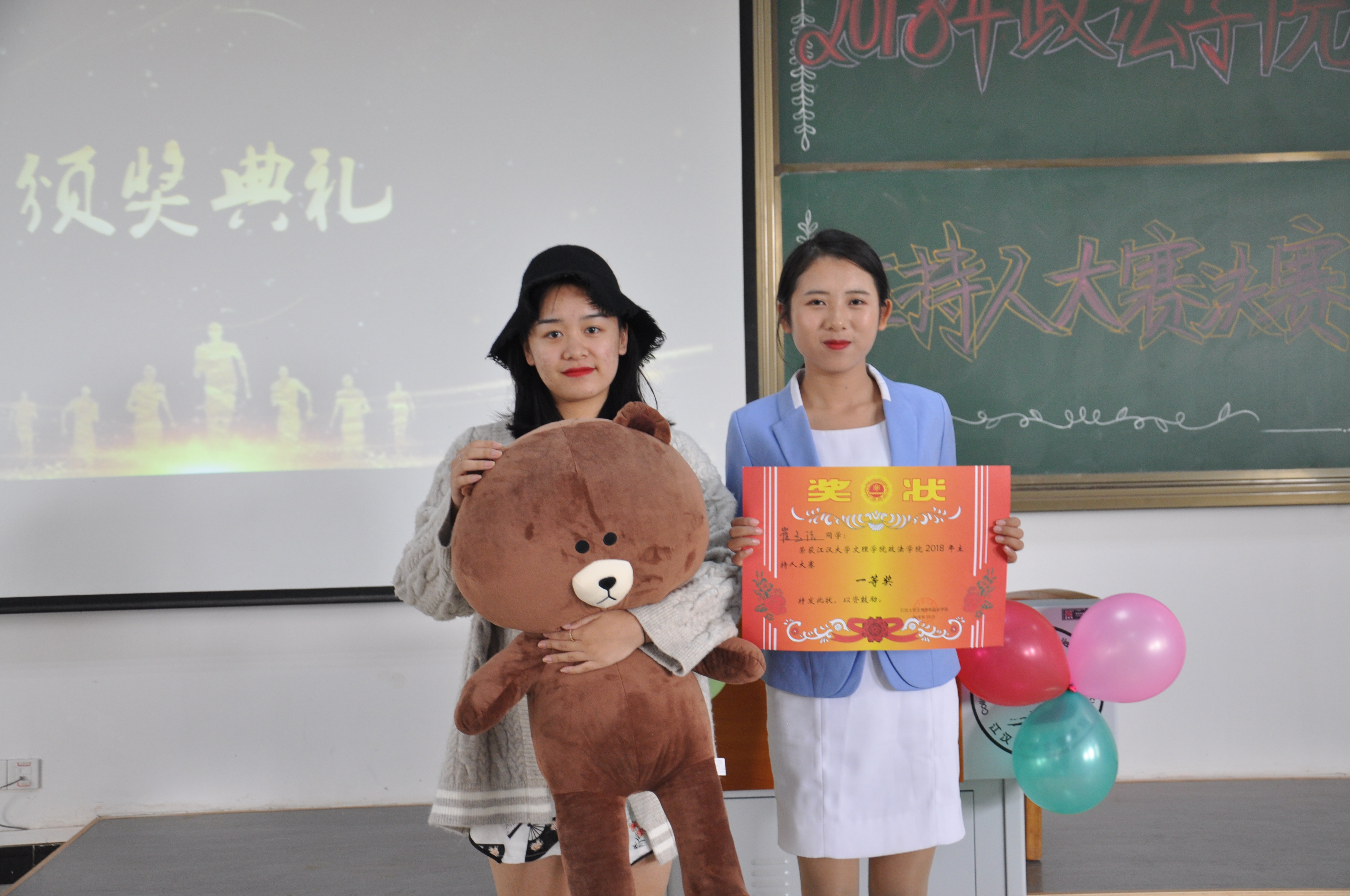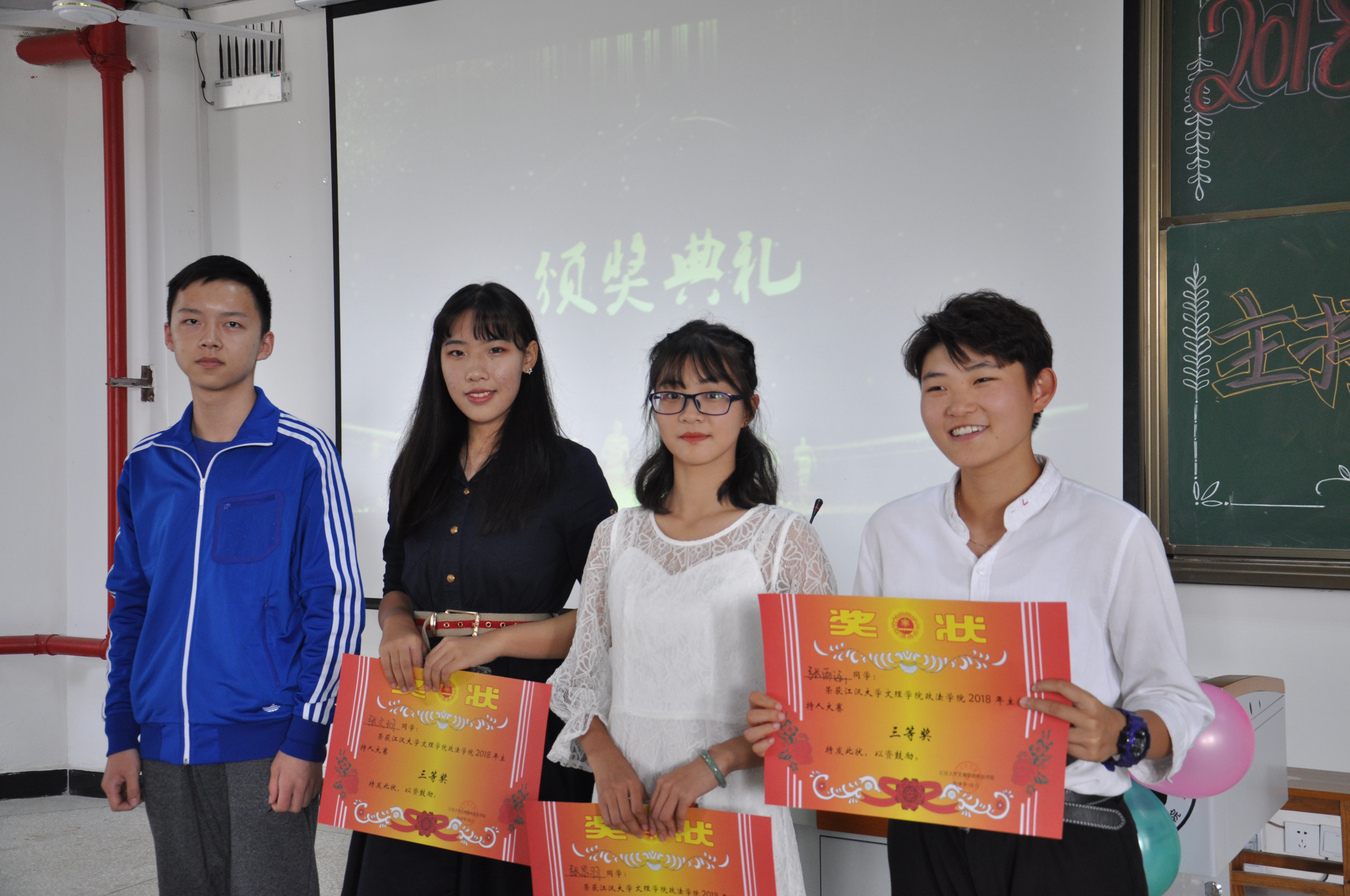 此次大赛共设有三个奖项,三等奖获得者张文玥、张雨涵、张思羽、吴聪聪由评委刘子豪为他们分发奖状奖品并合影留念;二等奖获得者孙佳怡、刘乂肆由评委罗佳欣为他们颁奖并合影留念;众人期待的一等奖获得者由《今日说法》“主持人”崔玉洁摘得桂冠,由评委彭思怡为她颁奖并合影留念。他们都并非专业主持出身,却因为自己的热爱,勇于展现,始终坚持,终于在此次比赛中发光发亮。通过这次大赛,相信在场的所有政法学子都会勇于展现自己,勇于挑战自我,展示出青春风采,展现青春的力量。