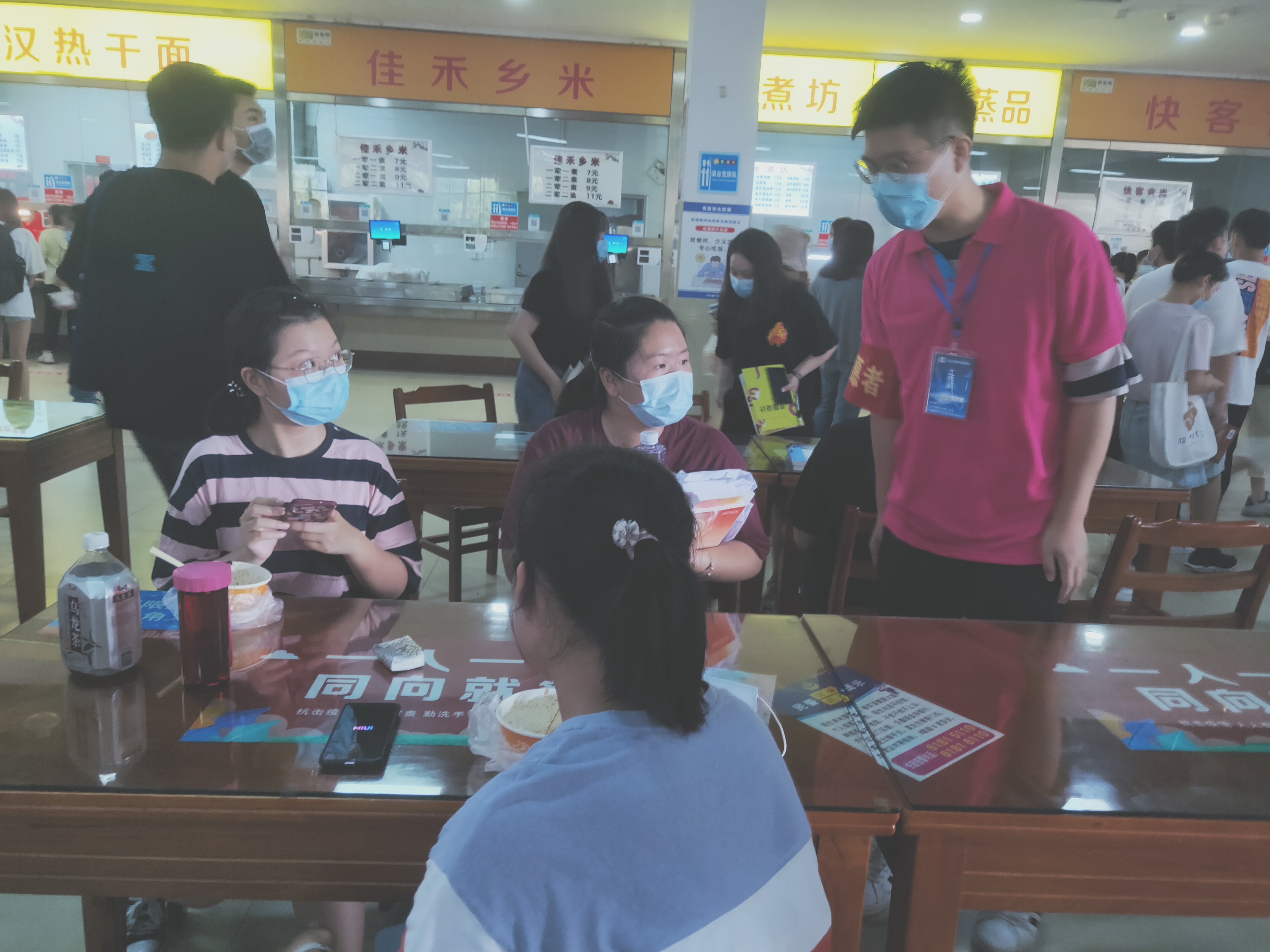 民以食为天,食以安为先。健康要从饮食做起。为做好新学期公司疫情防控工作,确保广大师生员工的身体健康。在伟德bv国际体育官方网站领导以及辅导员老师的指导下,从8月31日开始,政法分团委员工会的员工干部们身着政法小粉,佩戴好志愿者袖章,在新老食堂里开始了公司文明食堂就餐的志愿者引导工作。