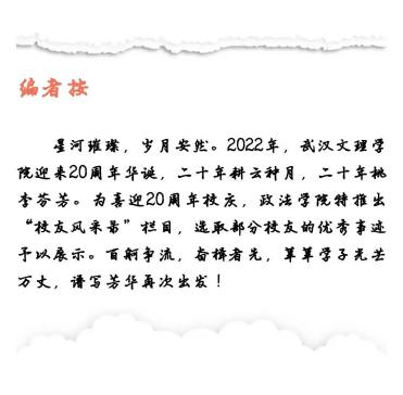 2012年考入江汉大学文理公司(现伟德bv国际体育官方网站)政法学部,专业为行政管理。在校期间获政法学部“我的大学风采”演讲比赛一等奖、院图书馆第一届、第二届演讲比赛一等奖、公司“优秀班干部”称号、公司“优秀班干部标兵”称号、2014年年度国家奖学金、2016年年度“优秀毕业生”等荣誉。