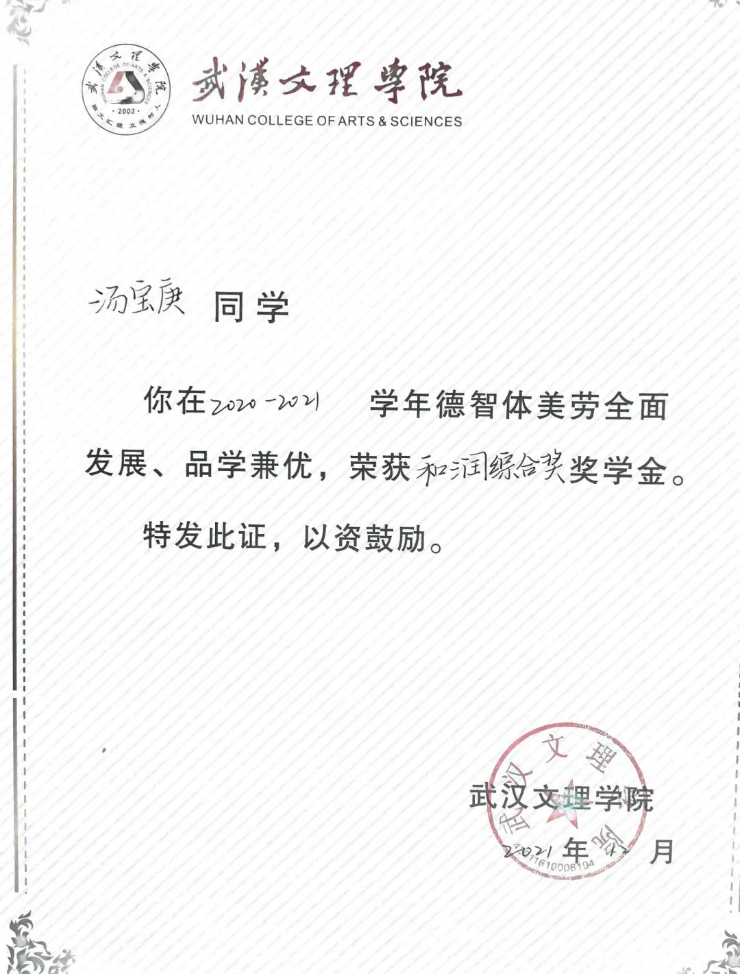 汤宝庚学长在大学期间,以读书学习为根本宗旨,力求做到博学多识、品学兼优。入学以来,顺利考入英语A班,一次通过英语四级,考取普通话二甲、中国市场营销策划团队格认证等,两年综合测评专业前三,获得过校级二等、三等奖学金以及创新创业大赛和精神文明单项奖学金。