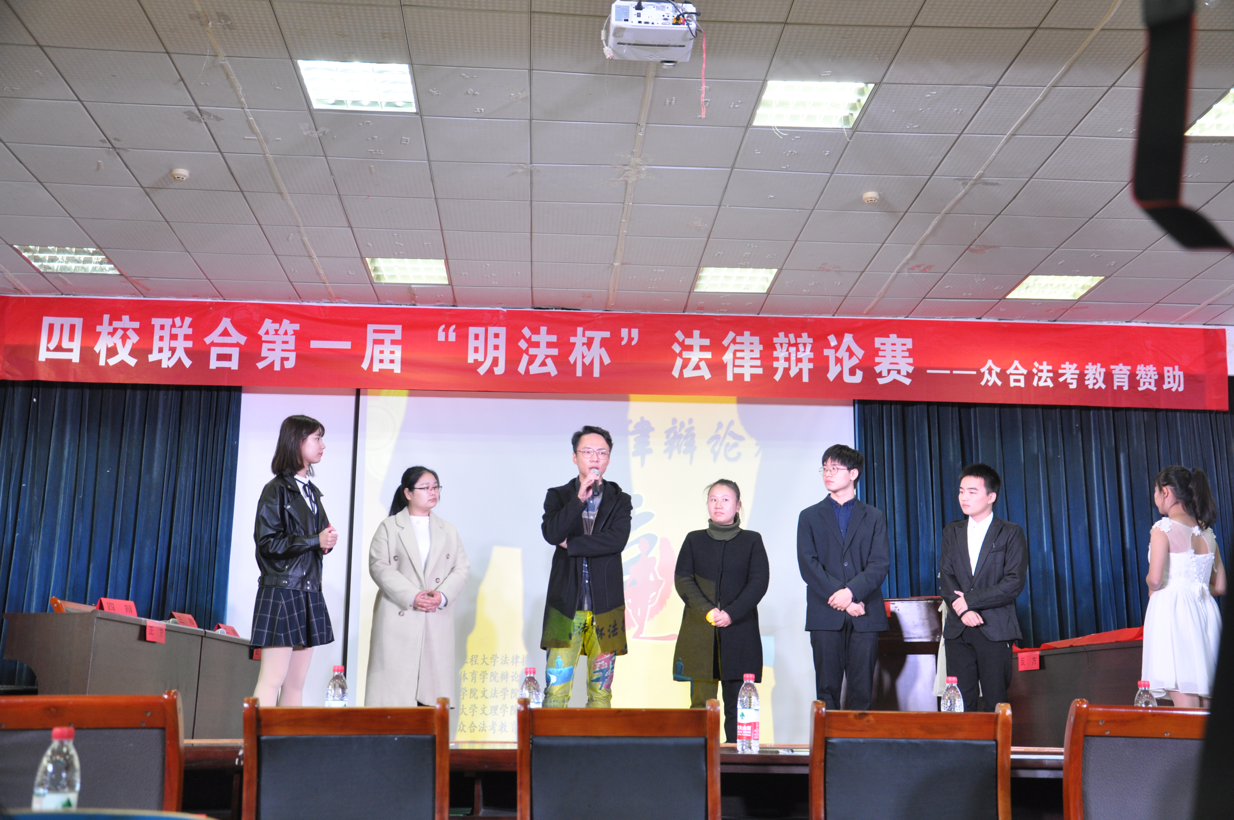 伊始,由主办方武汉工程大学法律援助中心会长与武汉工程大学法律指导老师开场致词以及对与会辩手评委观众表以热烈欢迎。即后,由四校代表老师及其员工代表上台讲话,预祝本次“明法杯”辩论赛圆满成功。